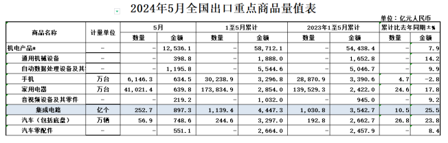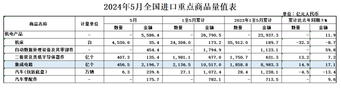 2024年1-5月,我国出口集成电路4447.3亿元,增长25.5%;进口集成电路1.05万亿元,增长17.1%