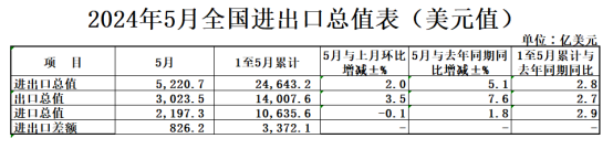 2024年1-5月我国进出口总额24643亿美元,同比增长2.8%。其中,出口同比增长2.7%,进口同比增长2.9%