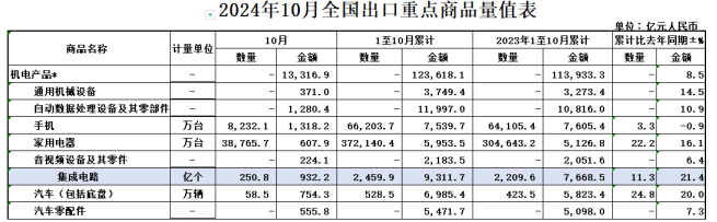 前10个月,我国出口机电产品12.36万亿元,增长8.5%,占我出口总值的59.4%。其中,集成电路9311.7亿元,增长21.4%;手机7539.7亿元,下降0.9%;汽车6985.4亿元,增长20%。